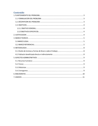 Este documento presenta un proyecto para crear lámparas con material reciclable para mejorar la iluminación en las calles y veredas del pueblo de El Carmen de Viboral. El proyecto usará botellas plásticas llenas de agua como lentes para capturar la luz solar y proyectarla hacia abajo. Esto mejorará la seguridad al reducir los delitos y accidentes causados por la falta de iluminación. El proyecto beneficiará directamente a los residentes locales y también a quienes transitan por las zonas con nuevas