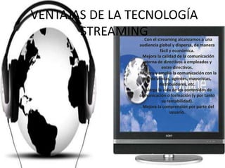 El documento describe las ventajas y desventajas de la tecnología de streaming. Las ventajas incluyen alcanzar una audiencia global de manera económica, mejorar la comunicación interna y externa, y alargar la vida útil de los contenidos. Las desventajas son obtener una buena calidad, necesitar software de servidor y cliente compatibles, y requerir un ancho de banda superior a 28.8 Kbps. La conclusión es que el streaming es útil pero que se necesita mayor capacidad y velocidad de internet para mejorar la tecnología