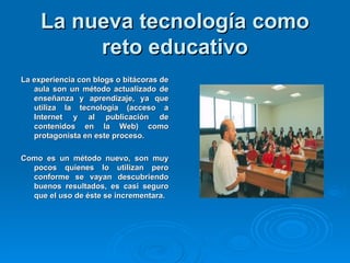El documento habla sobre el uso de blogs en el aula como un método actualizado de enseñanza y aprendizaje que utiliza la tecnología. Explica que los blogs de aula pueden usarse para publicar contenidos creados por estudiantes y maestros, y también como herramientas complementarias en tareas académicas. Describe algunos objetivos comunes de los blogs de aula como fomentar el debate, mejorar la escritura y conocer la sociedad de la información.