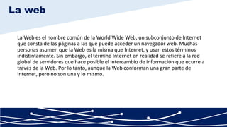 La Web es una parte de Internet que permite compartir información a través de páginas que pueden ser accedidas por un navegador web. Aunque muchos usan los términos indistintamente, Internet se refiere a la red global de servidores, mientras que la Web es el subconjunto que permite el intercambio de información a través de páginas.