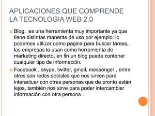 La tecnología web 2.0 permite a los usuarios subir contenido como fotos, videos y blogs a la web y participar activamente. Incluye aplicaciones como blogs, redes sociales como Facebook y Twitter para interactuar con otros, y herramientas como Voo2do y Digg. Es importante porque facilita la comunicación y el trabajo al proveer plataformas fáciles de usar para publicar información.