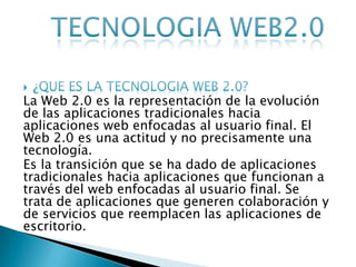 La Web 2.0 representa la evolución de aplicaciones tradicionales a aplicaciones enfocadas en el usuario final que permiten la colaboración a través de la web. Implica el uso de software basado en la web sin necesidad de instalación, y la creación de redes de colaboración a través de recursos en línea.