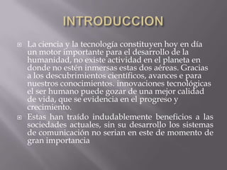 El documento resume la relación entre la ciencia y la tecnología. Explica que la ciencia se refiere al conjunto de conocimientos acumulados en forma de principios y leyes, mientras que la tecnología es la aplicación sistemática de esos conocimientos científicos a actividades prácticas. También describe algunas características de la ciencia y la tecnología, como su potencial para fines positivos o negativos, y la necesidad de especialización en la investigación científica.