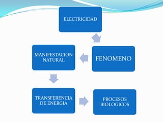 Este documento trata sobre conceptos básicos de electricidad como corriente eléctrica, cargas eléctricas, conductores eléctricos, aislantes eléctricos, principios de la electricidad, corriente directa, sistemas trifásicos, centrales eléctricas, circuitos eléctricos e intensidad y resistencia de corriente. Explica cómo la electricidad se manifiesta a través de fenómenos naturales y procesos biológicos y cómo se transfiere energía a través de magnetismo y corrient