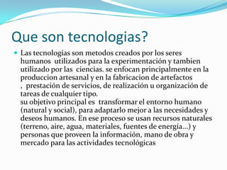 Este documento describe las tecnologías como métodos creados por humanos para transformar el entorno natural y adaptarlo mejor a las necesidades humanas, utilizando recursos naturales y mano de obra. Explica que las tecnologías se aplican principalmente para la transformación del medio ambiente a través de la urbanización, pero que un mal uso puede causar consecuencias como la deforestación, contaminación y calentamiento global. Finalmente, propone estudiar los impactos ambientales de proyectos tecnológicos y tomar recaudos para minimizar efectos negativos y