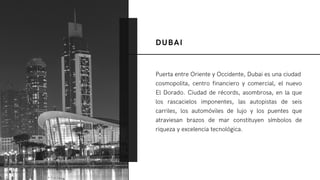 El documento describe las técnicas constructivas contemporáneas utilizadas en Dubai. Menciona que Dubai se ha convertido en la ciudad con la arquitectura más vanguardista debido a la incorporación de nuevas tecnologías en la construcción. Describe algunos de los sistemas constructivos utilizados como cimentación por pilotaje, estructuras de hormigón armado, acero estructural y cerramientos de vidrio. También resalta algunas obras importantes construidas en Dubai como la Torre Cayan, el Burj Khalifa y el Burj Al Arab.