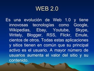 El documento describe las características y tecnologías clave de la Web 2.0, incluyendo sitios populares como Google, Wikipedia, eBay y YouTube que permiten a los usuarios crear y compartir contenido. La Web 2.0 se centra en la participación y el contenido generado por los usuarios, y las páginas se actualizan continuamente gracias a las contribuciones de los usuarios. Las tecnologías clave incluyen Ajax, RSS, blogs, wikis y etiquetas que permiten nuevas formas de interactuar e intercambiar información en la web.