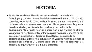 El documento resume brevemente la historia de la tecnología y su relación con la guerra. Explica cómo los avances científicos y tecnológicos han ido de la mano con el desarrollo de armamentos más destructivos, llevando a guerras cada vez más catastróficas. También analiza la actual "guerra de cuarta generación" y los esfuerzos por dominar la mente de las personas a través de la tecnología. Finalmente, destaca la importancia de la educación y la lucha de ideas frente a estas