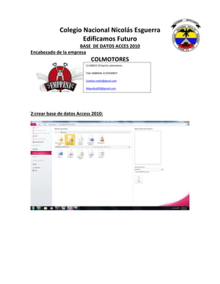 El documento proporciona instrucciones para crear una base de datos en Access 2010 para la empresa Colmotores. Incluye pasos para crear la base de datos con el nombre de la empresa, y una tabla llamada "Clientes" para almacenar información sobre los clientes.