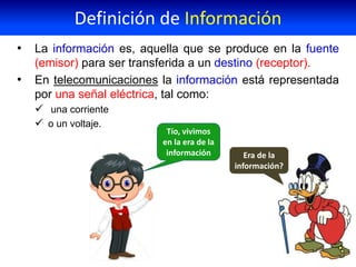 El documento describe los conceptos fundamentales de la información y la comunicación en telecomunicaciones, incluyendo la definición de datos, medios de transmisión, y diversos tipos de señales. También se abordan las estructuras de redes y los dispositivos de comunicación que facilitan la transmisión de datos, así como los protocolos y las técnicas de transmisión. Se presentan distintos modos de transmisión, como simplex, half-duplex y full-duplex, explicando cómo se comunican los dispositivos en diferentes contextos.