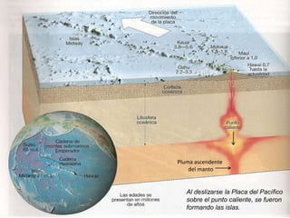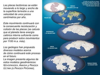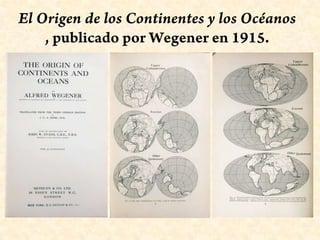 El documento habla sobre la hipótesis de la deriva continental propuesta por Wegener en 1915. Wegener propuso que hace unos 200 millones de años existió un supercontinente llamado Pangea que luego se separó en continentes más pequeños que migraron a sus posiciones actuales. Wegener ofreció evidencias como el encaje de los continentes, fósiles similares en áreas separadas y la continuidad de estructuras geológicas para apoyar su teoría.