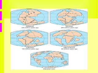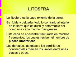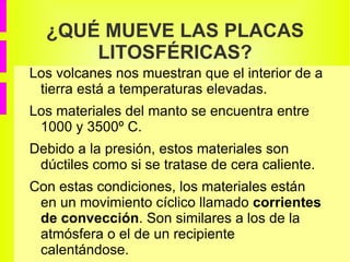 El documento explica la teoría de la tectónica de placas, que propone que la corteza terrestre está dividida en grandes placas que se mueven debido a las corrientes de convección en el manto. Esto causa la deriva de los continentes, la formación de dorsales oceánicas, fosas oceánicas, y es responsable de fenómenos como los terremotos y la actividad volcánica.