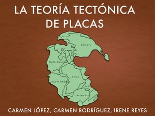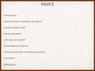 La teoría tectónica de placas explica que la litosfera terrestre está dividida en placas tectónicas que se mueven debido a las corrientes de convección en el manto. Hay 15 placas mayores y 43 menores que interactúan en límites constructivos, destructivos o pasivos. El movimiento de placas causa fenómenos como volcanes, terremotos y la formación de montañas. Se basa en las teorías anteriores de expansión del fondo oceánico y deriva continental.