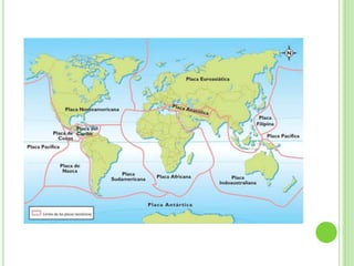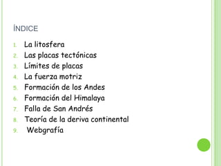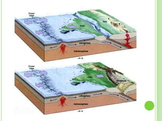 La tectónica de placas es responsable de la formación de las características del relieve terrestre. La litosfera está compuesta por la corteza y el manto superior rígidos, sobre los que flotan las placas tectónicas. Estas placas se mueven debido a las corrientes de convección en el manto, chocando y separándose a lo largo de sus límites. Los principales tipos de límites son convergentes, divergentes y de fricción. Las colisiones y subducciones de placas han dado lugar a la