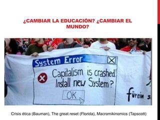 Este documento discute cómo la educación puede cambiar para adaptarse a la sociedad digital. Propone que la educación debe moverse de la enseñanza de contenidos a la guía y el autoaprendizaje, y enfocarse más en desarrollar competencias como la creatividad, la intuición y las habilidades de relación. También sugiere que la educación debe ocurrir en entornos informales y enriquecidos que utilicen historias, multimedia e inmersión. El objetivo final es preparar a los estudiantes para una sociedad basada en la abundancia de información