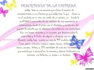 Teddy bear es una empresa que ofrece el servicio de diseñar y fabricar peluches personalizados para clientes. Cuenta con más de 150 modelos de peluches y 250 variedades de ropa para personalizar los peluches como princesas, bailarinas o bomberos. Teddy bear se especializa en el diseño, fabricación y comercialización de peluches de alta calidad e innovadores diseños. Sus peluches buscan expresar sentimientos de afecto, amor y amistad a través de su dulzura y ternura.