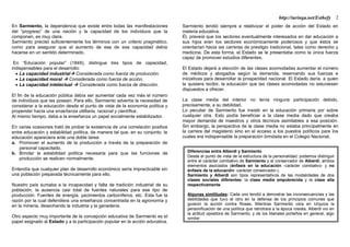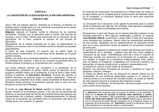 Este documento describe las concepciones de la educación en la historia argentina previa a 1880 de diferentes pensadores como Belgrano, Alberdi y Sarmiento. Mientras Belgrano y Rivadavia promovían la educación agrícola e industrial, Alberdi creía que la inmigración, ferrocarriles y leyes eran más efectivos que la educación. Sarmiento en cambio consideraba a la educación como el factor principal para el cambio social, especialmente la educación primaria. El documento también analiza las diferencias entre las visiones de Alberdi y Sarmiento sobre el