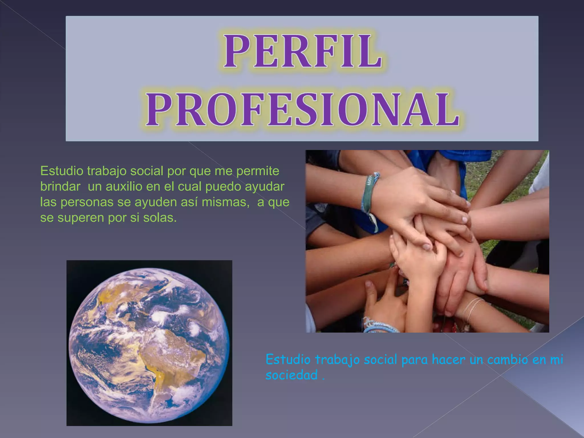 El estudiante desea estudiar trabajo social para ayudar a las personas a superarse a sí mismas y hacer un cambio positivo en la sociedad. El trabajo social permite desarrollarse como persona y trabajar en diversas áreas como salud, educación, vivienda y con poblaciones vulnerables como personas con discapacidad o en exclusión social. Se requiere sensibilidad social, actitud crítica y habilidades para el trabajo en equipo.