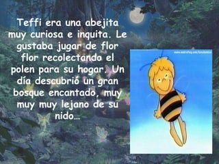 Teffi era una abejita curiosa que descubrió un bosque encantado habitado por hadas. La reina hada le dijo que una antigua profecía predecía que Teffi salvaría el reino de un terrible monstruo. En la batalla final, Teffi se transformó en un hada poderosa y derrotó al monstruo, salvando el reino de las hadas.