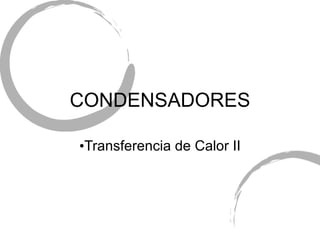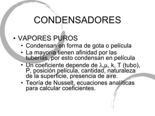 Este documento trata sobre los condensadores de vapor puro y las ecuaciones para calcular los coeficientes de transferencia de calor. Explica que la mayoría de los vapores tienden a condensar en forma de película y no de gotas, y que el coeficiente de transferencia depende de propiedades como la conductividad térmica, viscosidad y diferencia de temperatura. También presenta ecuaciones analíticas de Nusselt para calcular los coeficientes para tubos verticales u horizontales.