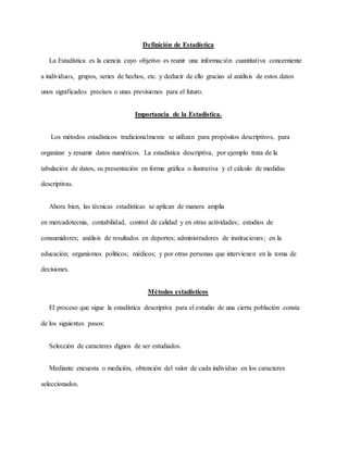 Este documento proporciona una introducción a la estadística. Define la estadística y explica que estudia datos cuantitativos para deducir significados y previsiones. Describe métodos estadísticos como la estadística descriptiva y la inferencial. También cubre conceptos clave como población, muestra, variables, y distribución de frecuencias. El objetivo final es proporcionar una visión general de la estadística y sus aplicaciones.
