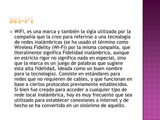 El documento resume las tecnologías de internet que brindan conectividad inalámbrica y acceso a información, como WiFi, redes inalámbricas, libros digitales, y herramientas como chat, web, correo electrónico e IRC.