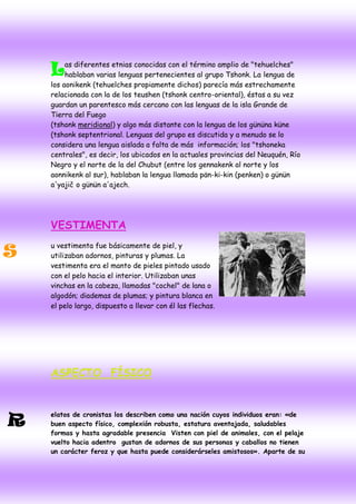 Los tehuelches eran varios pueblos indígenas que habitaban la Patagonia y la región pampeana. Hablaban diferentes lenguas emparentadas y compartían rasgos culturales. Vivían de la caza y recolección y se movían estacionalmente por sus territorios. Eran diestros artesanos y tenían una rica cultura musical. Aunque móviles, establecían campamentos fijos y cada grupo tenía un territorio definido. En la actualidad, algunos de sus descendientes viven en reservas del sur de Argentina y mantienen parte de