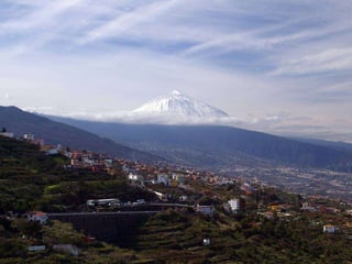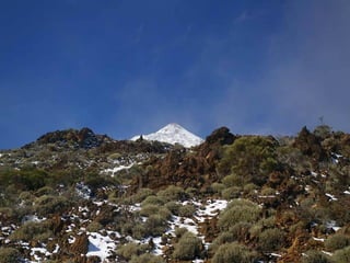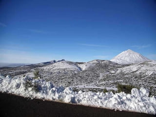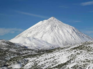 El documento describe el Monte Teide, el pico más alto de España situado en la isla de Tenerife, Islas Canarias. El Monte Teide fue declarado Patrimonio de la Humanidad por la UNESCO en 2007. El documento incluye fotos que muestran vistas del Monte Teide desde diferentes puntos, así como detalles sobre su geología, formación volcánica y erupciones recientes.