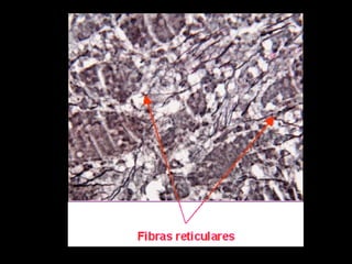 El documento describe el tejido conectivo, incluyendo su función de soporte estructural, interconexión de tejidos e intercambio entre células y circulación. Explica que hay tres tipos principales de tejido conectivo - adiposo, fibroso y conjuntivo - que se diferencian por la sustancia fundamental amorfa y las fibras de colágeno, elastina o reticulares que contienen. Finalmente, detalla las características de estas fibras y sustancias que componen la matriz extracelular del tejido conectivo.