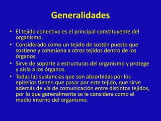 Este documento describe las características generales del tejido conectivo. Explica que hay tejido conectivo especializado y no especializado, siendo este último subdividido en tejido conectivo laxo y denso (regular e irregular). Describe las características, componentes, localización y función de cada uno.