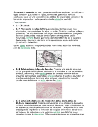 El documento describe el tejido conectivo, un tejido formado por células poco diferenciadas con abundante matriz extracelular. Cumple funciones de unir otros tejidos, brindar soporte y nutrición, y proteger el organismo. Está constituido por células como fibroblastos, adipocitos y leucocitos inmersas en una matriz extracelular compuesta de sustancia fundamental y fibras colágenas, elásticas y reticulares. Existen diferentes tipos como el tejido conectivo laxo y denso.