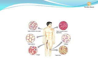 El documento describe las características del tejido conjuntivo, incluyendo sus principales células y funciones. El tejido conjuntivo está compuesto de células como fibroblastos, células reticulares y adipocitos, inmersas en una matriz extracelular. También incluye células migratorias como macrófagos y linfocitos. Las células cumplen funciones de sostén, almacenamiento y defensa.