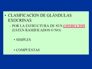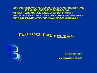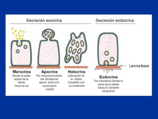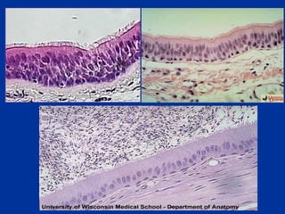 Este documento describe las características y clasificación de los tejidos epiteliales. Explica que el epitelio está compuesto de células muy juntas que recubren superficies internas y externas del cuerpo. Describe los diferentes tipos de epitelio como simple, estratificado y de transición, y sus funciones y localizaciones. También explica las especializaciones apicales como microvellosidades, estereocilios y cilios y su papel en la absorción y transporte.