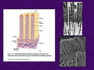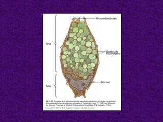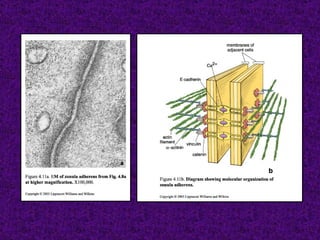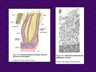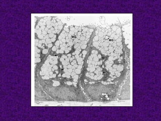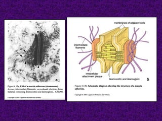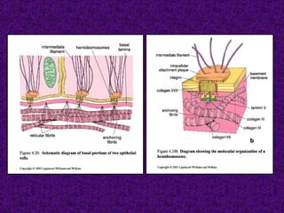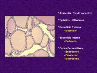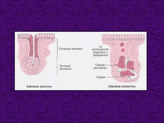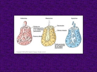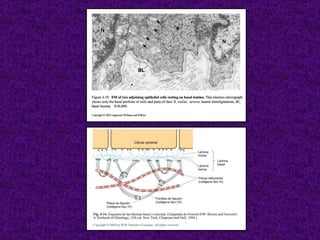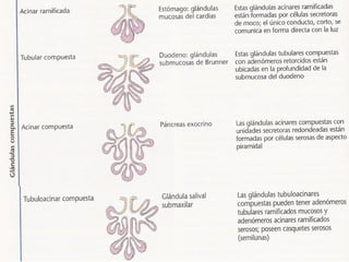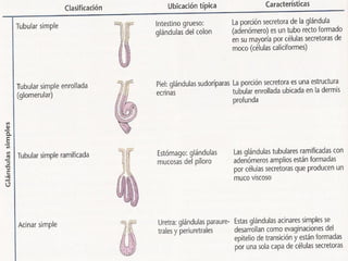 El documento aborda el tejido epitelial, describiendo su estructura, clasificaciones y funciones, incluyendo tipos como epitelio plano simple y cilíndrico. Destaca las especializaciones celulares en la superficie apical y basolateral, así como la importancia de las glándulas exocrinas y endocrinas en el sistema. También menciona patologías clínicas relacionadas con estos tejidos, como el síndrome de Kartagener y adenocarcinomas.