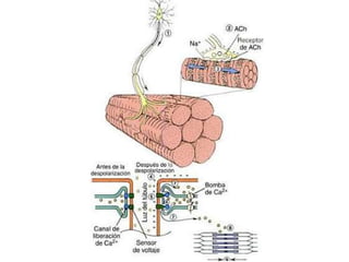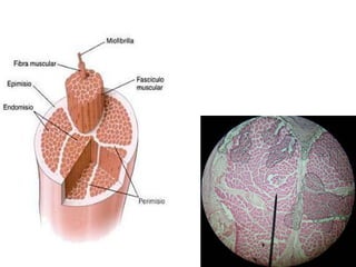 El documento presenta un análisis detallado del tejido muscular, incluyendo sus tipos (esquelético, cardíaco y liso), estructuras celulares y mecanismos de contracción. Describe las características de las fibras musculares esqueléticas y sus clasificaciones, así como los procesos de inervación y la regeneración del tejido. También se discuten las particularidades del músculo cardíaco y liso, haciendo hincapié en sus funciones y diferencias estructurales.
