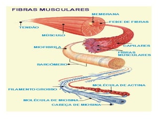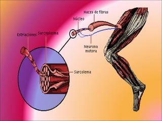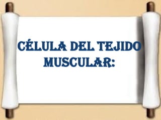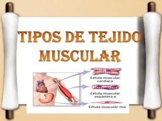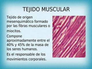 El documento describe el tejido muscular, incluyendo su composición, tipos y funciones. Existen tres tipos principales de tejido muscular: estriado voluntario (esqueleto), cardíaco y liso. El músculo esquelético controla el movimiento y está formado por células multinucleadas, el cardíaco bombea la sangre de forma involuntaria, y el liso controla los órganos internos y vasos sanguíneos.