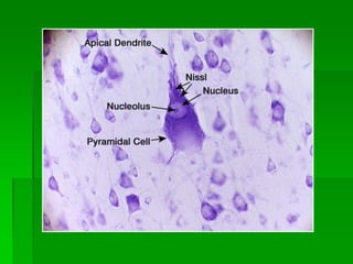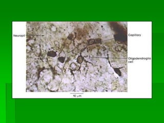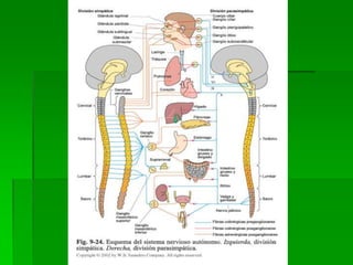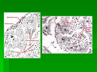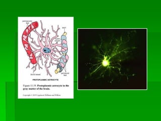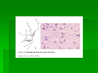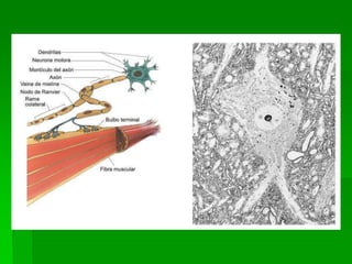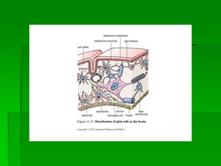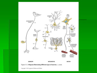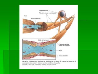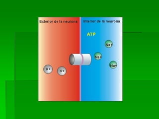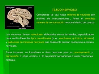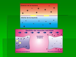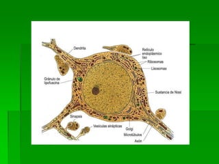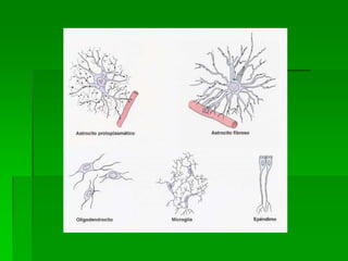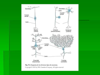 Este documento describe la estructura y función del sistema nervioso. Explica que está compuesto de neuronas y células gliales que forman complejas redes de comunicación. Describe la organización del sistema nervioso central y periférico, y los diferentes tipos de neuronas y células gliales. También explica conceptos como la generación y conducción de impulsos nerviosos, la sinapsis y los neurotransmisores.