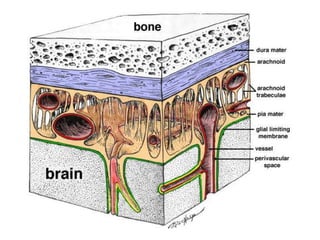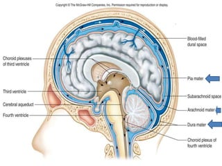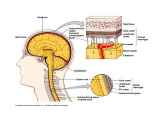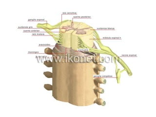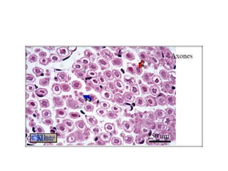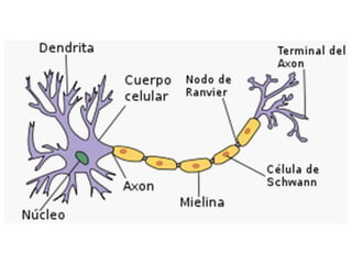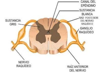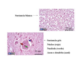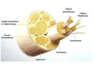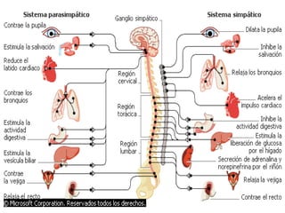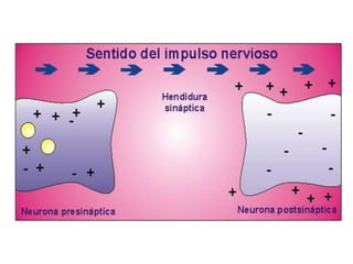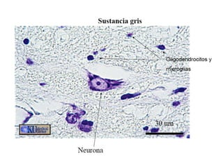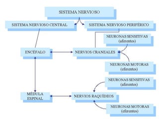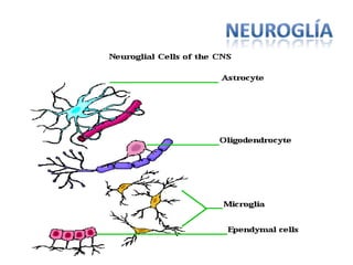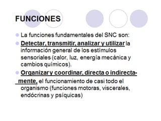 El documento describe la anatomía y fisiología del sistema nervioso. Se divide en sistema nervioso central (encéfalo y médula espinal) y sistema nervioso periférico (nervios y ganglios). Funcionalmente se divide en somático (control voluntario) y autónomo (control involuntario de funciones vitales). El sistema autónomo contiene las divisiones simpática y parasimpática. El documento también describe las neuronas, sinapsis, neurotransmisores, y células de sostén del tejido nervioso como astrocitos, oligod