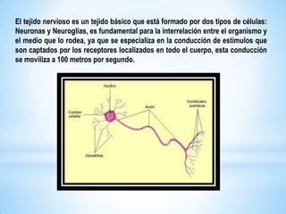 El tejido nervioso está formado por neuronas y neuroglías. Las neuronas reciben estímulos y transmiten impulsos nerviosos a gran velocidad, mientras que las neuroglías proveen soporte y controlan el microambiente neuronal. Ambos tipos de células trabajan juntos para permitir la comunicación y procesamiento de información en el sistema nervioso.