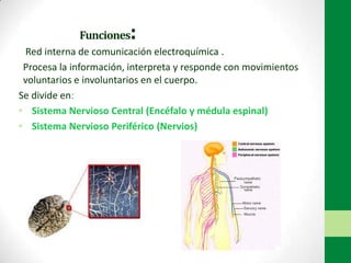 El documento describe el tejido nervioso, incluyendo sus funciones de procesar y transmitir información para controlar el movimiento. Explica que está dividido en el sistema nervioso central y periférico. La unidad funcional es la neurona, la cual se compone de un cuerpo celular y prolongaciones como dendritas y axones. También describe los tipos de neuronas, la sinapsis y sus componentes, así como las células de la glía como astrocitos y oligodendrocitos que brindan soporte al tejido nervioso.