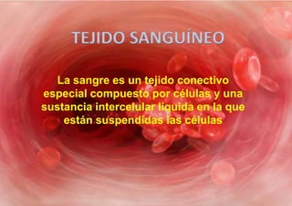 Este documento describe el tejido sanguíneo. Explica que la sangre está compuesta de células y plasma. Las células incluyen eritrocitos, leucocitos como neutrófilos y linfocitos, y plaquetas. El plasma transporta gases, nutrientes, hormonas y desechos. También describe cómo se prepara un frotis sanguíneo para estudiar las células bajo el microscopio usando colorantes.