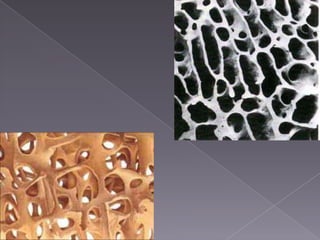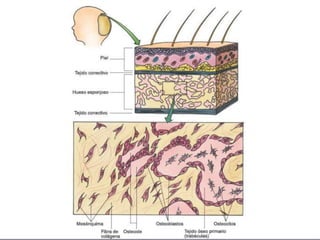 El hueso es un tejido conectivo especializado compuesto de células y una matriz extracelular calcificada. Sirve como órgano de sostén, protege órganos vitales, y permite la locomoción al actuar como punto de inserción muscular. El hueso se organiza en dos formas: hueso esponjoso con trabéculas entrecruzadas y huecos llenos de médula, y hueso compacto con sistemas de láminas y canales haversianos.