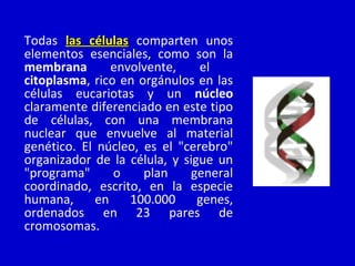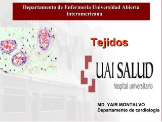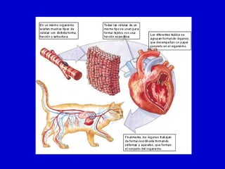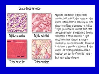 El documento describe los diferentes tipos de tejidos que componen el cuerpo humano, incluyendo epitelial, muscular, nervioso y conjuntivo. Explica que las células se diferencian para formar tejidos especializados que a su vez se agrupan para formar órganos que cumplen funciones vitales. Los tejidos trabajan de forma coordinada a través de los sistemas circulatorio, nervioso y endocrino para mantener la homeostasis del medio interno.