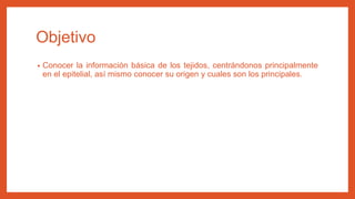 El documento describe los principales tejidos del cuerpo humano, incluyendo el epitelial, muscular, nervioso y conectivo. Explica que el tejido epitelial está compuesto de células poliédricas yuxtapuestas que forman capas continuas. Además, describe que las células epiteliales derivan de las tres capas germinativas embrionarias - ectodermo, mesodermo y endodermo - y cumplen funciones como el revestimiento, la absorción y la secreción.