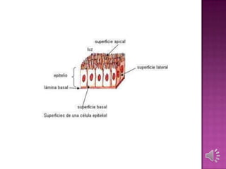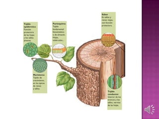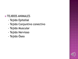 Este documento describe los diferentes tipos de tejidos animales y vegetales. En los animales se mencionan el tejido epitelial, conjuntivo, muscular, nervioso y óseo. En los vegetales se describen el tejido meristemático, protector, absorbente, mecánico, fundamental, conductor y glandular. Para cada tejido se especifican sus características y funciones principales.