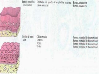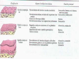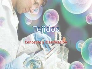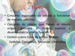 Hay cuatro tipos principales de tejidos: epitelial, conjuntivo, muscular y nervioso. El tejido epitelial está compuesto de células unidas estrechamente que forman una barrera entre la superficie y los tejidos subyacentes, mientras que el tejido conjuntivo contiene una abundante matriz extracelular con células dispersas. El tejido muscular se caracteriza por la capacidad contráctil de sus células, y el tejido nervioso por sus neuronas especializadas en la transmisión de impulsos eléctric