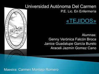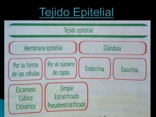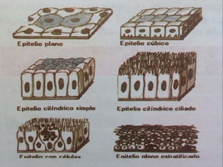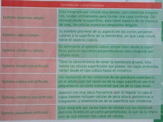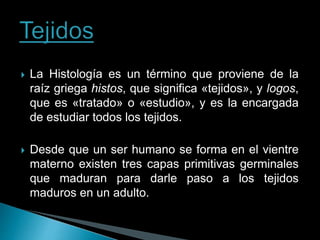 Este documento describe los principales tejidos del cuerpo humano: epitelial, conectivo, muscular y nervioso. Explica las características y funciones de cada tejido, incluyendo las células que los componen y cómo cumplen un papel importante en el funcionamiento del organismo.