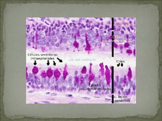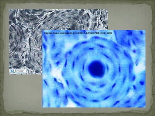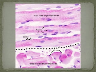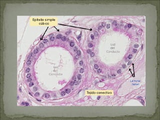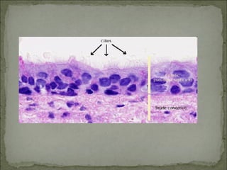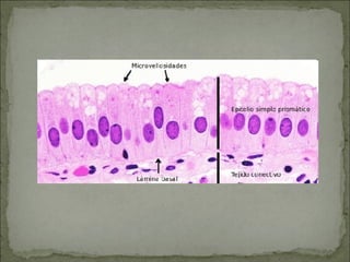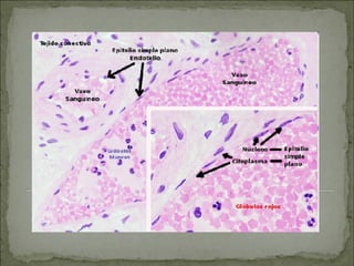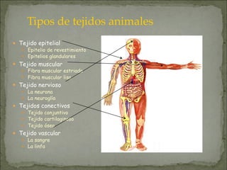 Este documento describe los principales tipos de tejidos animales, incluyendo el epitelial, muscular, nervioso, conectivo, cartilaginoso, óseo, vascular y sanguíneo. Explica las características, funciones y subtipos de cada tejido.