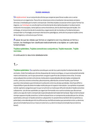Los tejidos animales están formados por células que cooperan para llevar a cabo funciones en los organismos. Existen cuatro tipos fundamentales de tejidos: epitelial, conectivo, muscular y nervioso. El tejido epitelial recubre superficies y está formado por células unidas entre sí. El tejido conectivo sirve de soporte a otros tejidos. El tejido muscular es responsable del movimiento y está formado por células alargadas llamadas miocitos. El tejido nervioso controla funciones vitales y está form