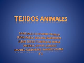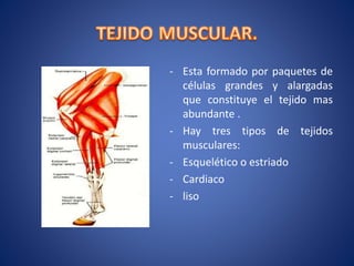 Este documento describe los principales tipos de tejidos del cuerpo humano. Identifica tres tipos de tejido muscular: esquelético, cardiaco y liso. También describe el tejido nervioso, compuesto de neuronas que reciben y transmiten estímulos, el tejido epitelial que cubre superficies y órganos, y el tejido conectivo, formado por huesos, cartílagos, tendones y ligamentos, tejido adiposo y dermis, que sostienen y conectan los órganos.